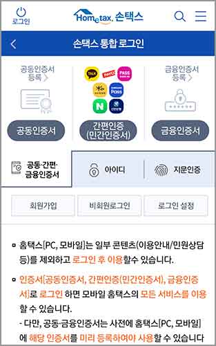 손택스 앱이 설치되었으면 공동인증서, 금융인증서, 간편 인증으로 로그인합니다. 단 공동인증서, 금융인증서는 미리 등록되어 있어야 합니다.